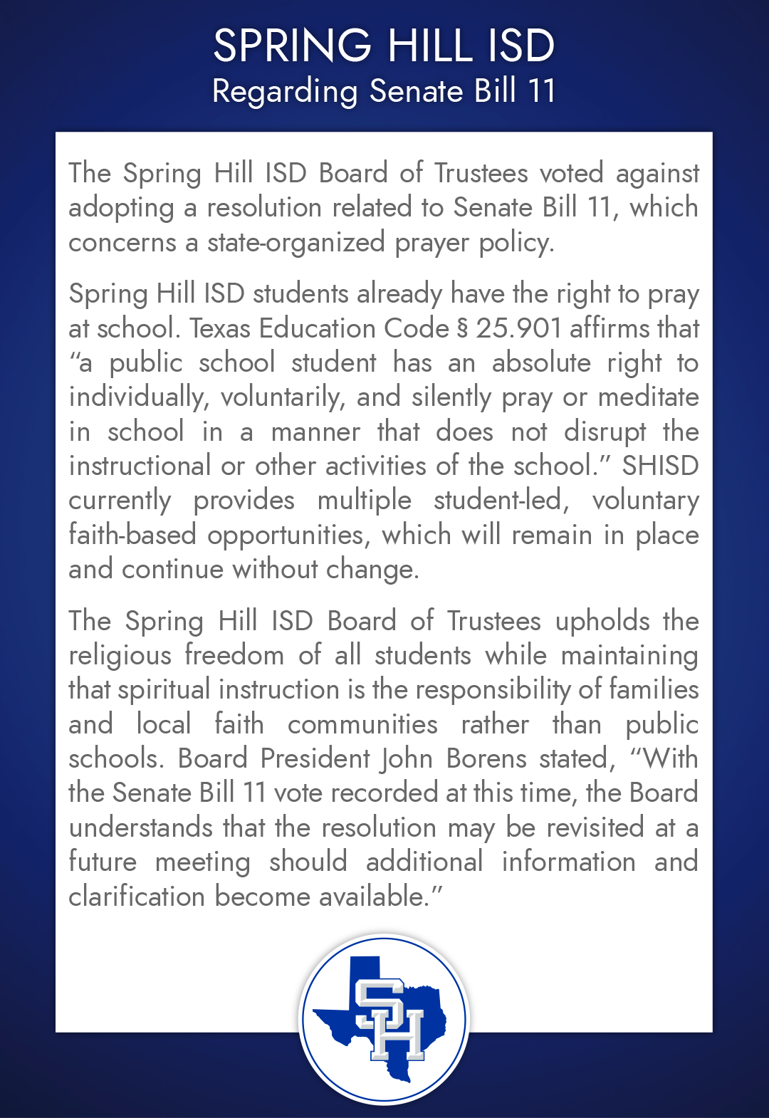The Spring Hill ISD Board of Trustees upholds the religious freedom of all students while maintaining that spiritual instruction is the responsibility of families and local faith communities rather than public schools. Board President John Borens stated, “With the Senate Bill 11 vote recorded at this time, the Board understands that the resolution may be revisited at a future meeting should additional information and clarification become available.”